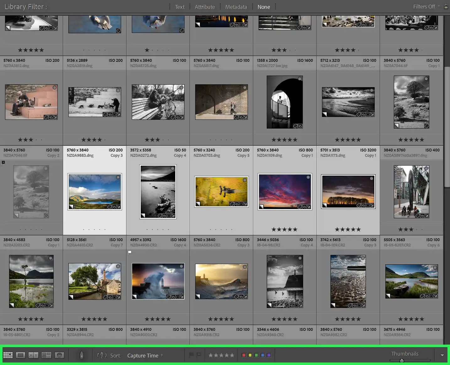 Grid view is Lightroom’s command centre — the place where you can see your entire shoot at once. It’s designed for fast, visual organisation: you can browse hundreds of images, compare variations using Virtual Copies, flag favourites, view ratings and colour labels, and apply keywords and metadata.