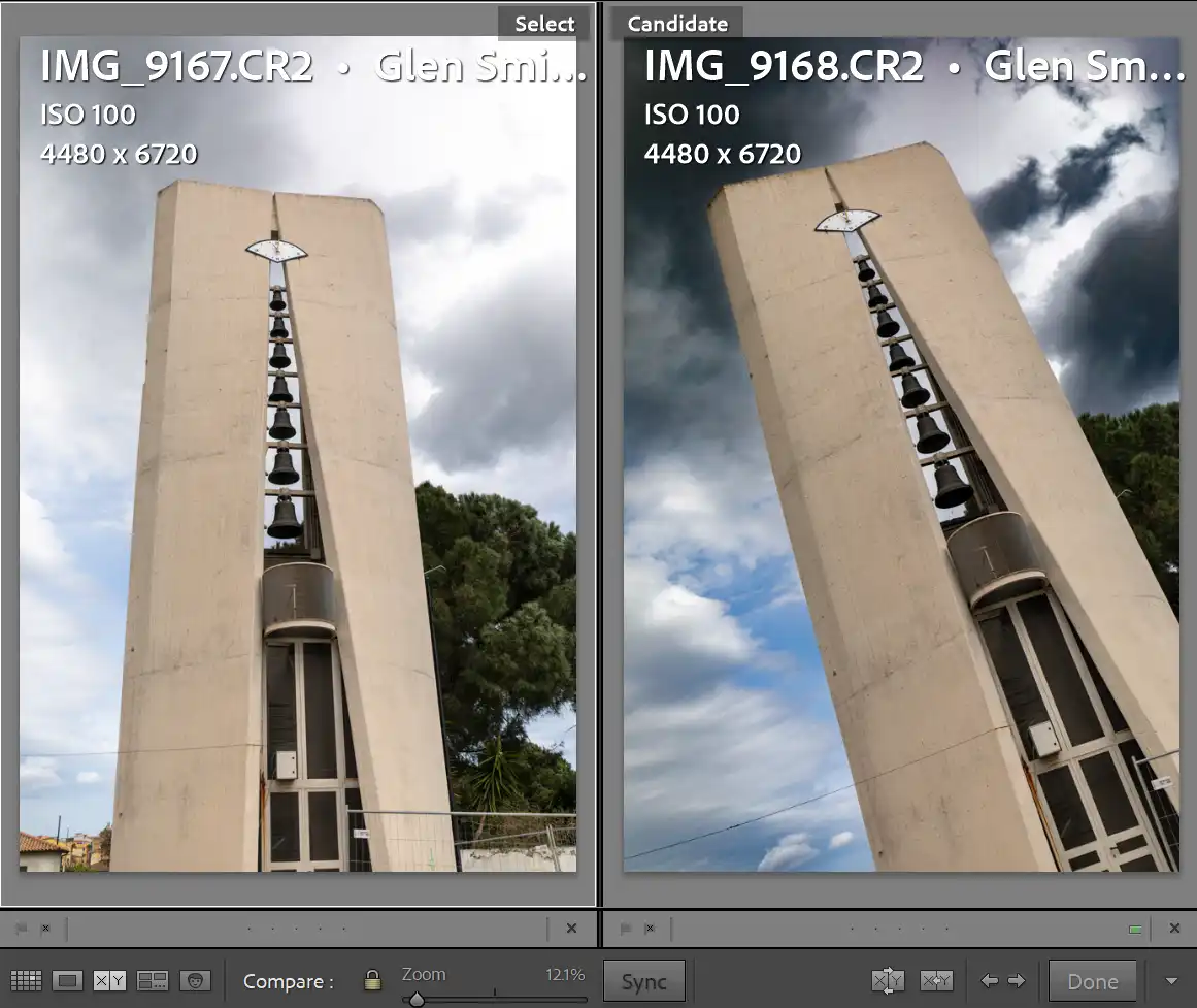 Use Compare View to compare two images. Compare any two images, but this is very useful for two very similar images. Seeing the images side by side can help make a confident choice between them. It shows a Select image alongside a Candidate, letting you flip through similar frames, check sharpness, evaluate expressions, and spot subtle differences that aren’t obvious in Grid or Loupe. Whether you’re choosing between near‑identical shots, or narrowing down a final set, Compare view gives you a clean, side‑by‑side workspace that makes tough decisions easier and more consistent.