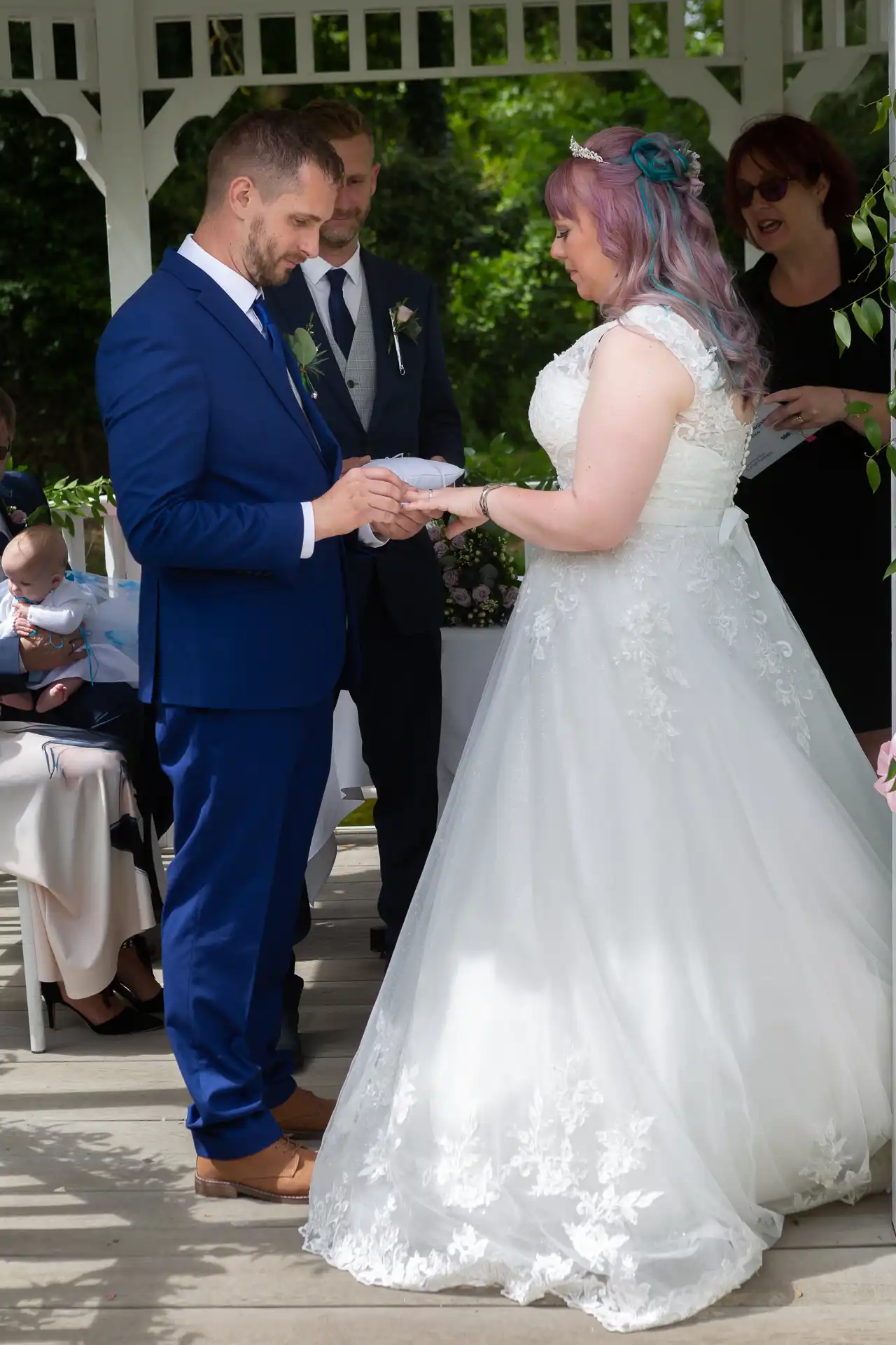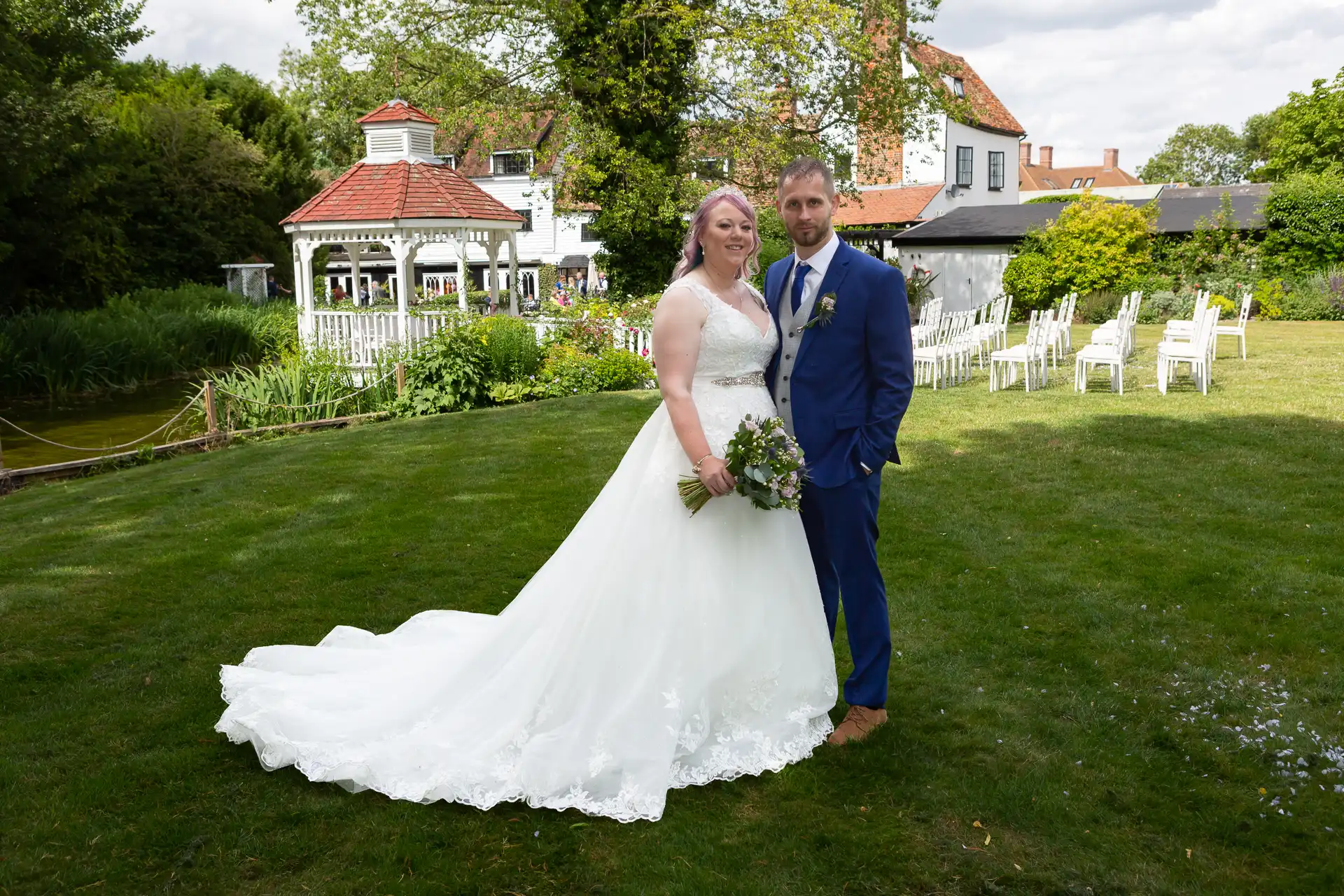 Sam and Kayleigh's cermony and reception were both held at Sheene Mill. The fine weather allowed the ceremony to take place outside in the outdoor wedding pavilion that is suspended across the River.