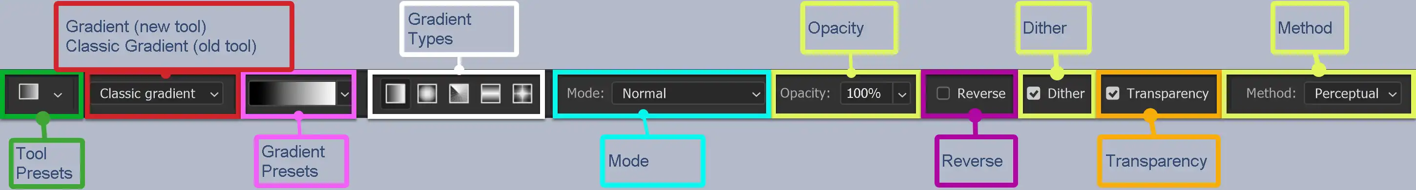 Classic Gradient is the old tool that existed prior to 2023. I strongly recommend you use the newer, much better Gradient tool and that is covered below.