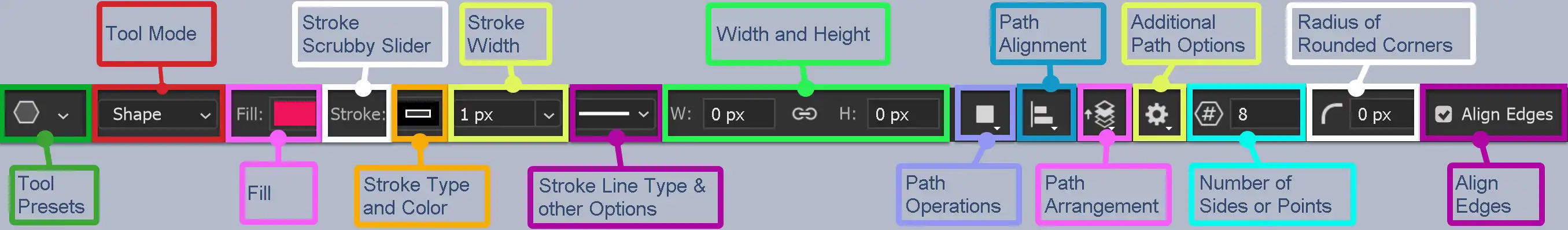 The Polygon Tool allows you to create Polygon paths and shapes. You can edit various options, such as the Fill, or the Stroke. You can choose to have rounded corners and control the radius of those corners, but only all the corners. Unlike the Rectangle tool you cannot adjust the radius independently for different corners.