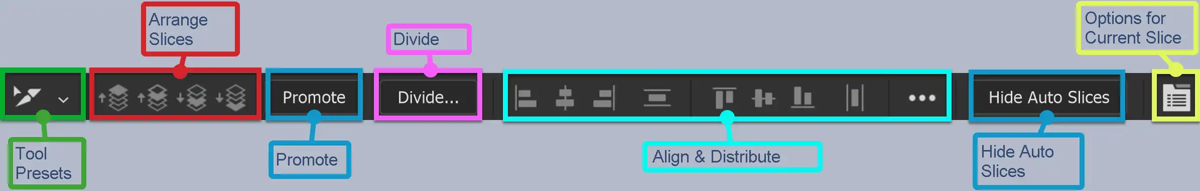 Align Slices to their top, bottom, left or right edges. Distribute (evenly space) Slices.